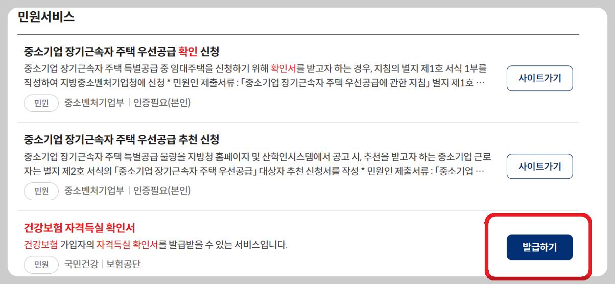 건강보험자격득실확인서'를 검색한 후, 발급하기 버튼을 눌러 줍니다.