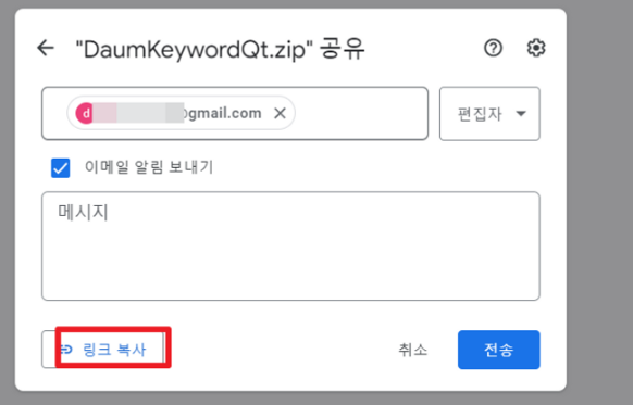 3) 링크 복사 버튼 클릭 => 링크를 메세지창에 붙여 넣기 합니다. => 전송