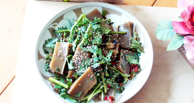 야채를 추가해봅시다: 파, 상추, 오이 등을 채썰어 도토리묵에 함께 섞어줍니다. 상큼한 야채가 조화를 이루며 색다른 맛을 느낄 수 있습니다.