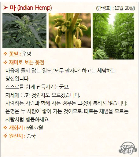 10월 20일 탄생화 대마입니다. 대마는 삼과 삼속에 속하는 식물로서 마(麻), 또는 삼이라고도하며, 꽃말은 운명입니다.
