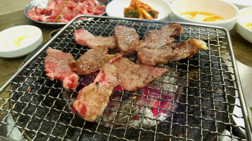 고기는 한우갈비살 소금구이입니다. 숯불 위에 올려 맛있게 구워서 고기는 염려와 달리 아주 부드러웠습니다.