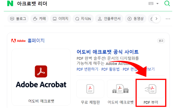 또는 네이버에서 검색하여 한글판 다운로드 링크로 이동하는 방법이 있습니다. 네이버 어도비 리더 검색하여 PDF 뷰어 클릭하여 진행하시면 됩니다.