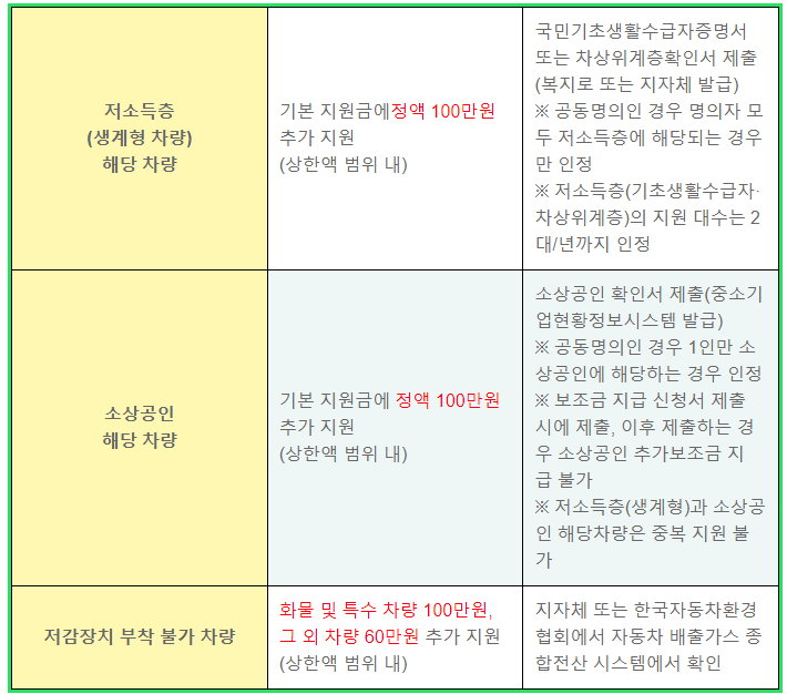 차량 소유주에 따라 추가 지원금이 있습니다. 소득이 낮거나 소상공인으로 인정되는 분들은 기본 지원금에 100만 원을 추가로 받을 수 있습니다. 추가 지원금을 받기 위해서는 별도의 신청 과정이 필요하며, 신청일 이전에 발급된 증빙서류를 제출해야 합니다.